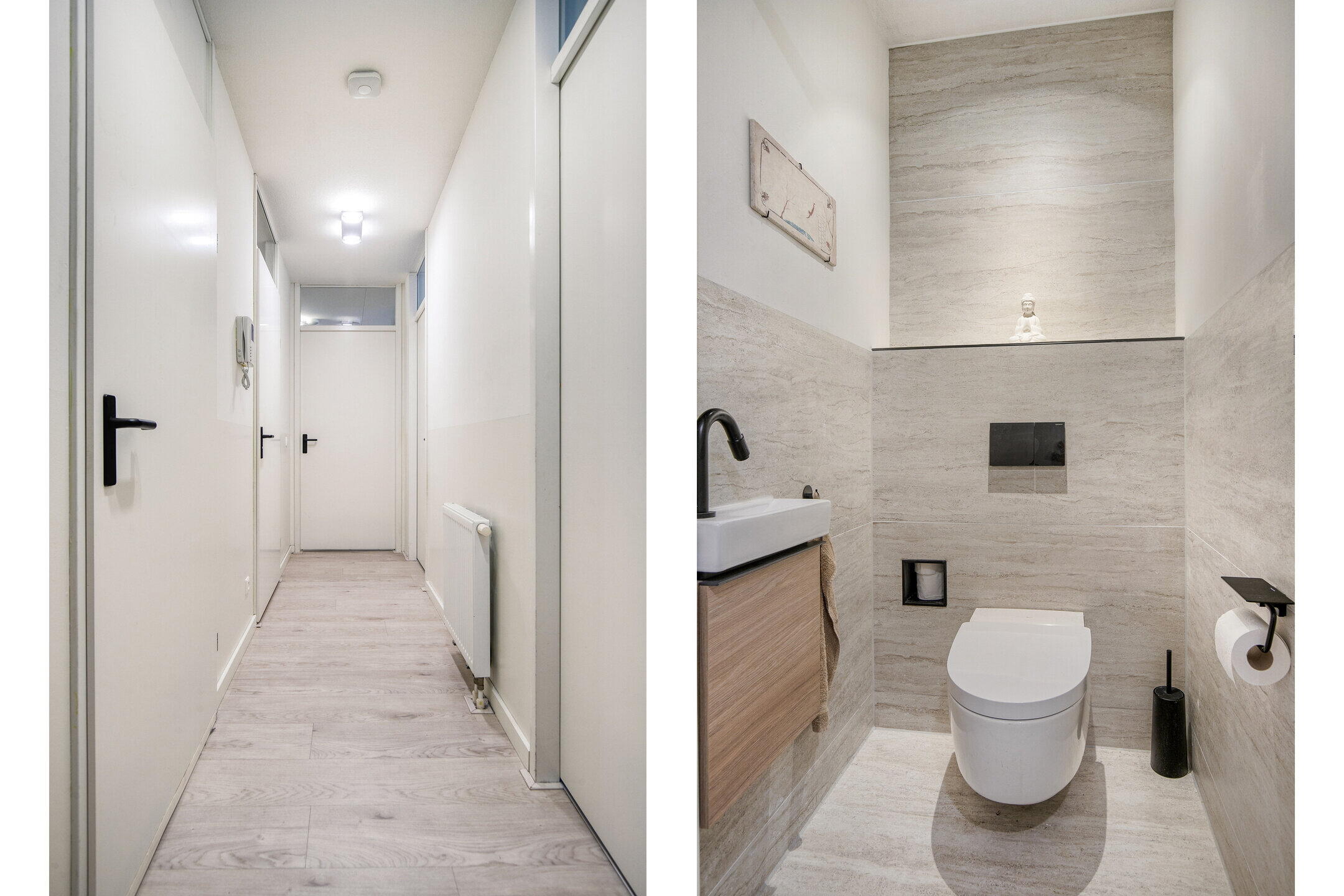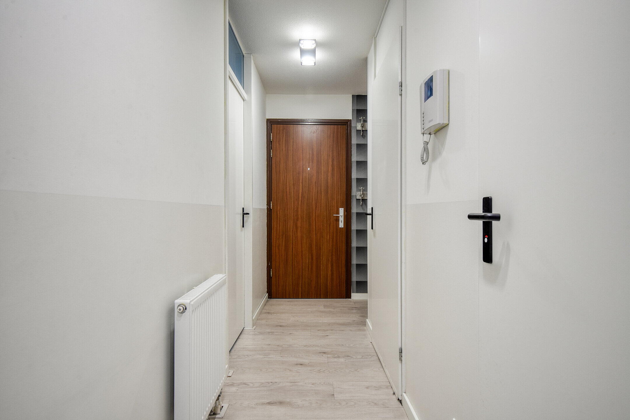 Toegang tot de privé-ingang op de tweede verdieping via de lift of trap. De hal geeft toegang tot alle slaapkamers, de badkamer, separaat toilet (met douchefunctie), de zonnige woonkamer met open keuken en ruime interne berging met boiler en warmteterugwinnings (WTW) unit. Slaapkamers bevinden zich aan de rustige parkzijde van het appartement. Aan de voorkant vind je de leuke en lichte woonkamer met uitzicht op het water. De open keuken ligt in het midden van het appartement en creëert een gezellige indeling. Het appartement heeft plafondhoge raamkozijnen met dubbele beglazing. Dit maakt het ook een zeer licht huis.
