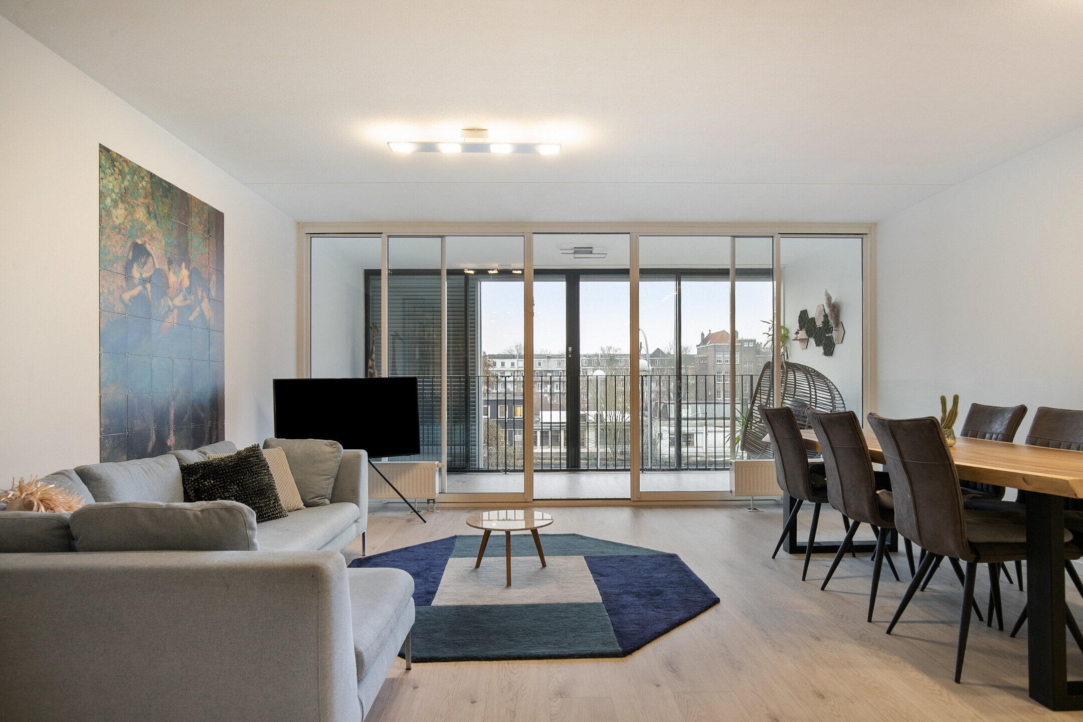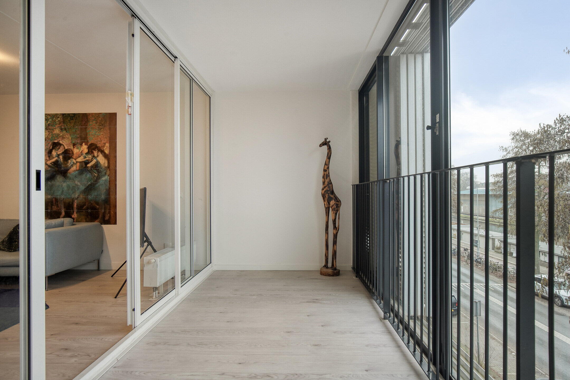 De lichte, zonnige woonkamer heeft een loggia met schuifdeuren aan twee zijden.